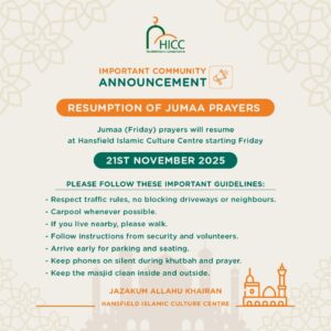 Alhamdulillah, we are pleased to share the great news that Jumaa (Friday) prayers will resume at Hansfield Islamic Culture Centre starting Friday, 21st November 2025, in shaa’ Allah.